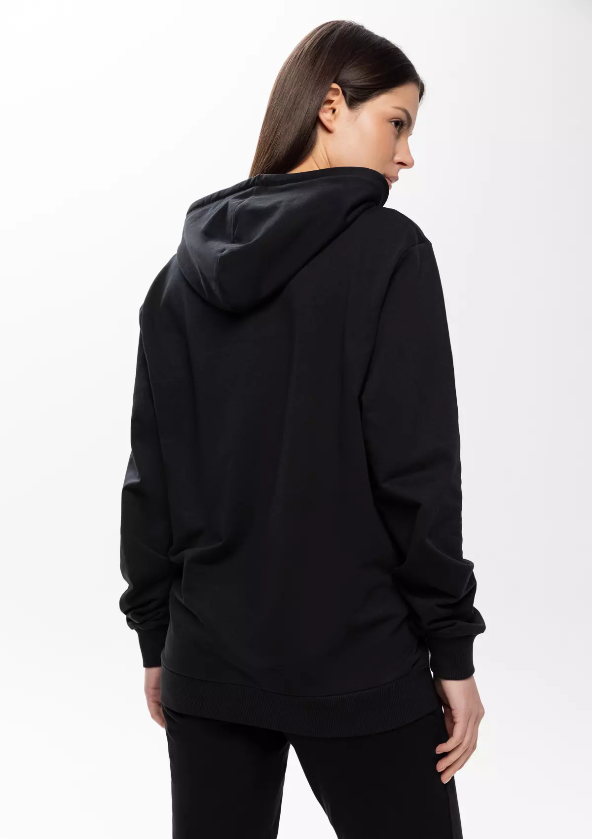 Толстовка прямого силуэта с капюшоном, втачным рукавом и карманом-кенгуру. Капюшон дополнен шнурком для регулирования прилегания, манжет и низ изделия оформлены широкой эластичной резинкой. Возможно два варианта исполнения: контрастные шнурок и бейка/шнурок и бейка в цвет толстовки.