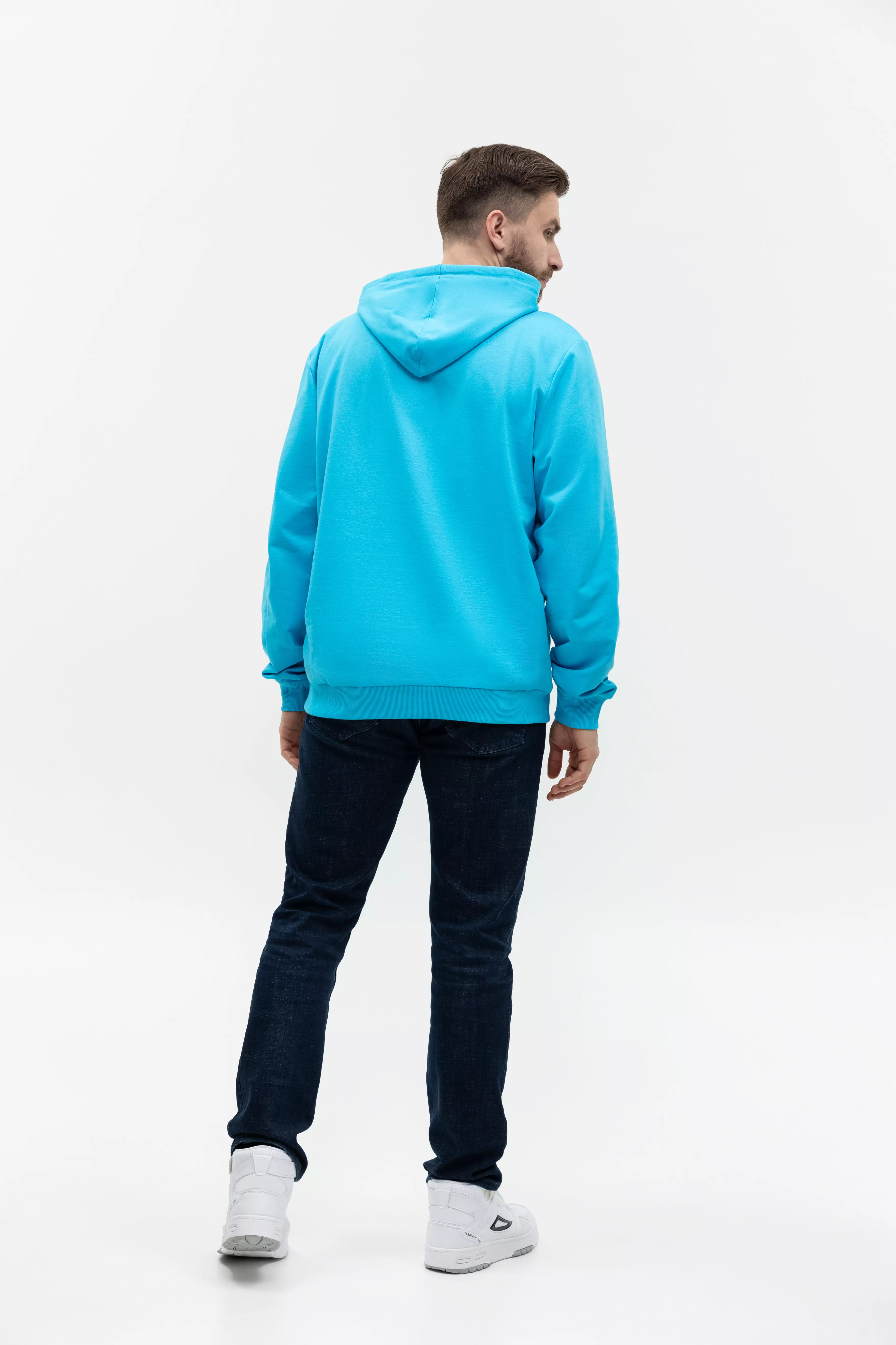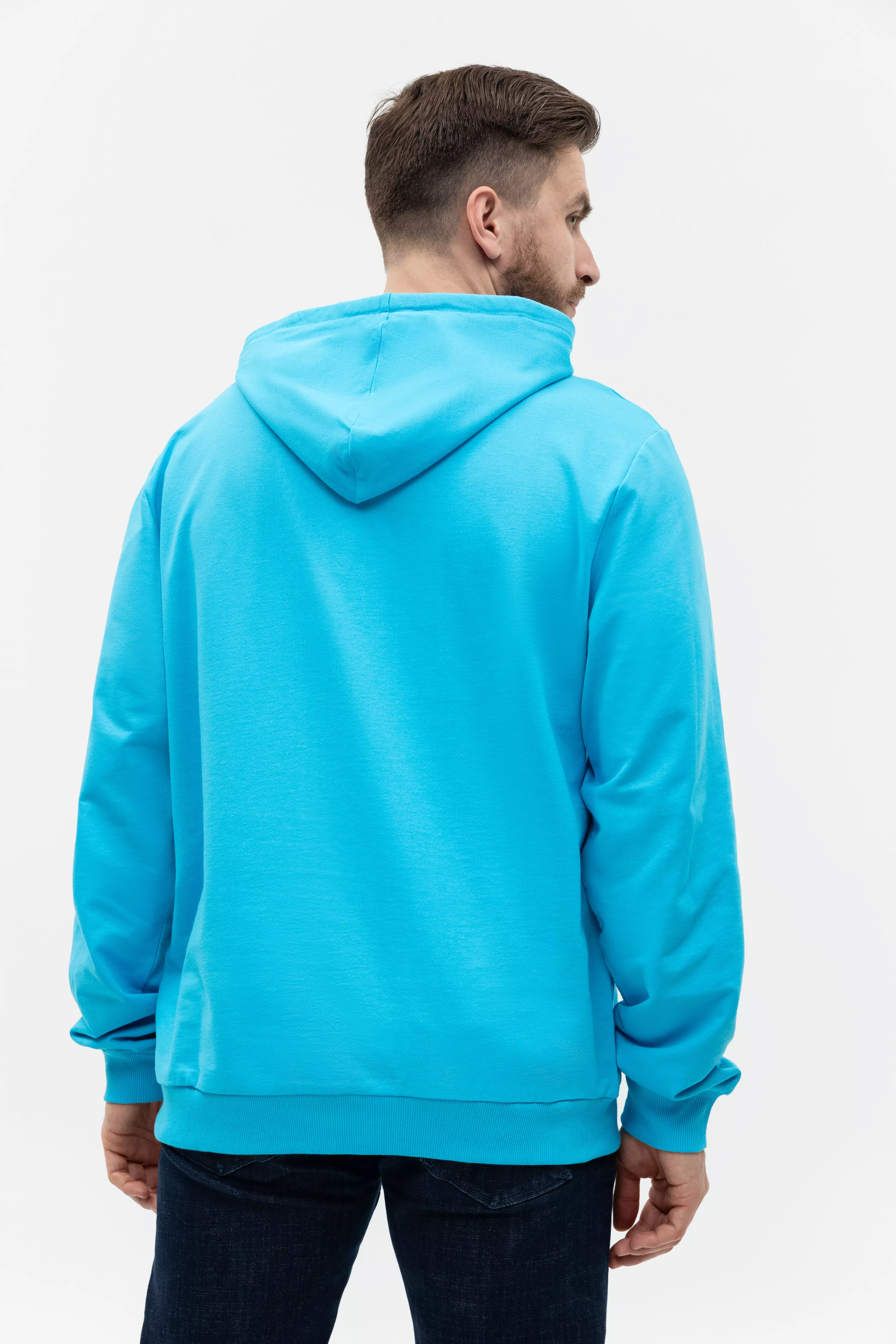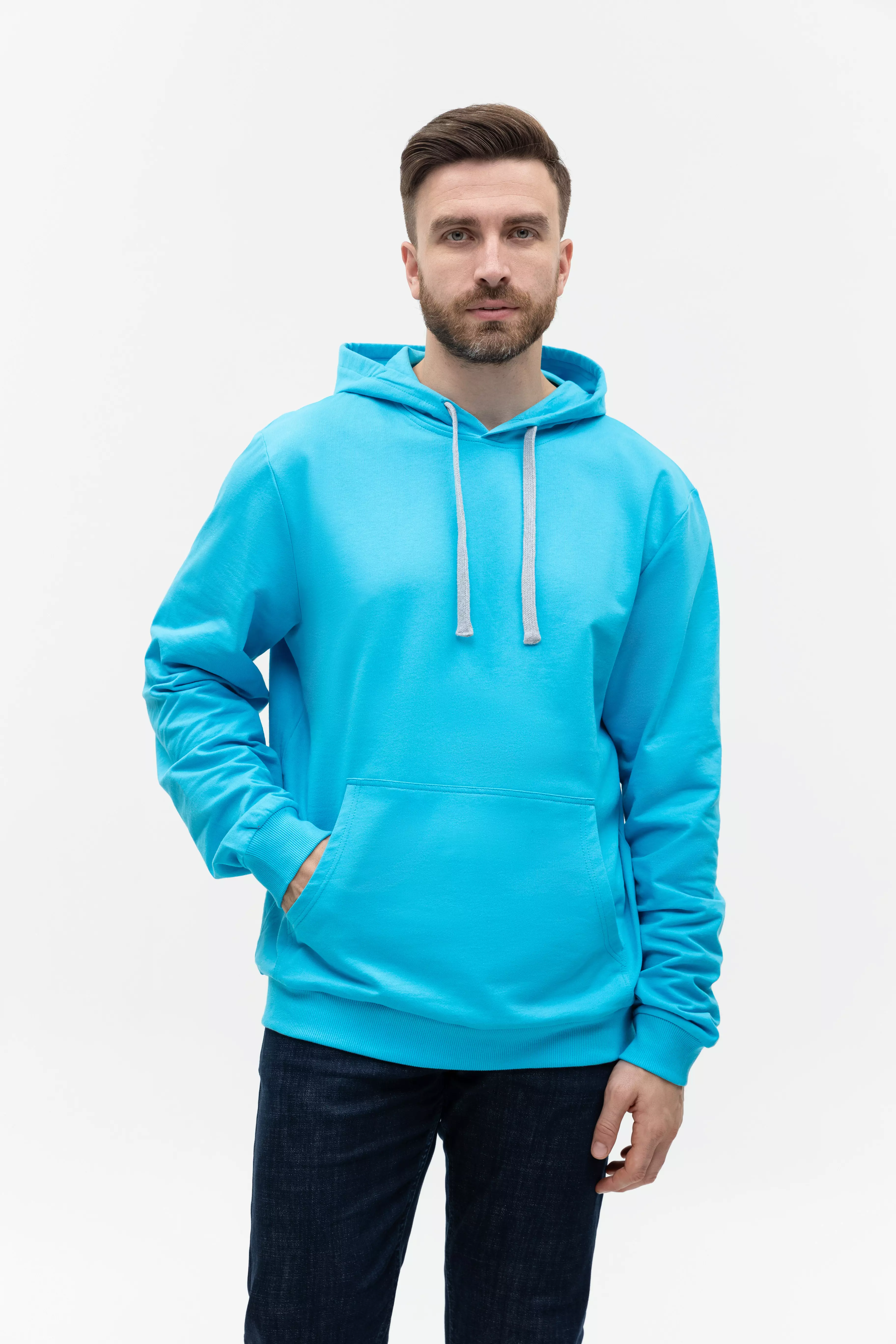 Толстовка прямого силуэта с капюшоном, втачным рукавом и карманом-кенгуру. Капюшон дополнен шнурком для регулирования прилегания, манжет и низ изделия оформлены широкой эластичной резинкой. Возможно два варианта исполнения: контрастные шнурок и бейка/шнурок и бейка в цвет толстовки.