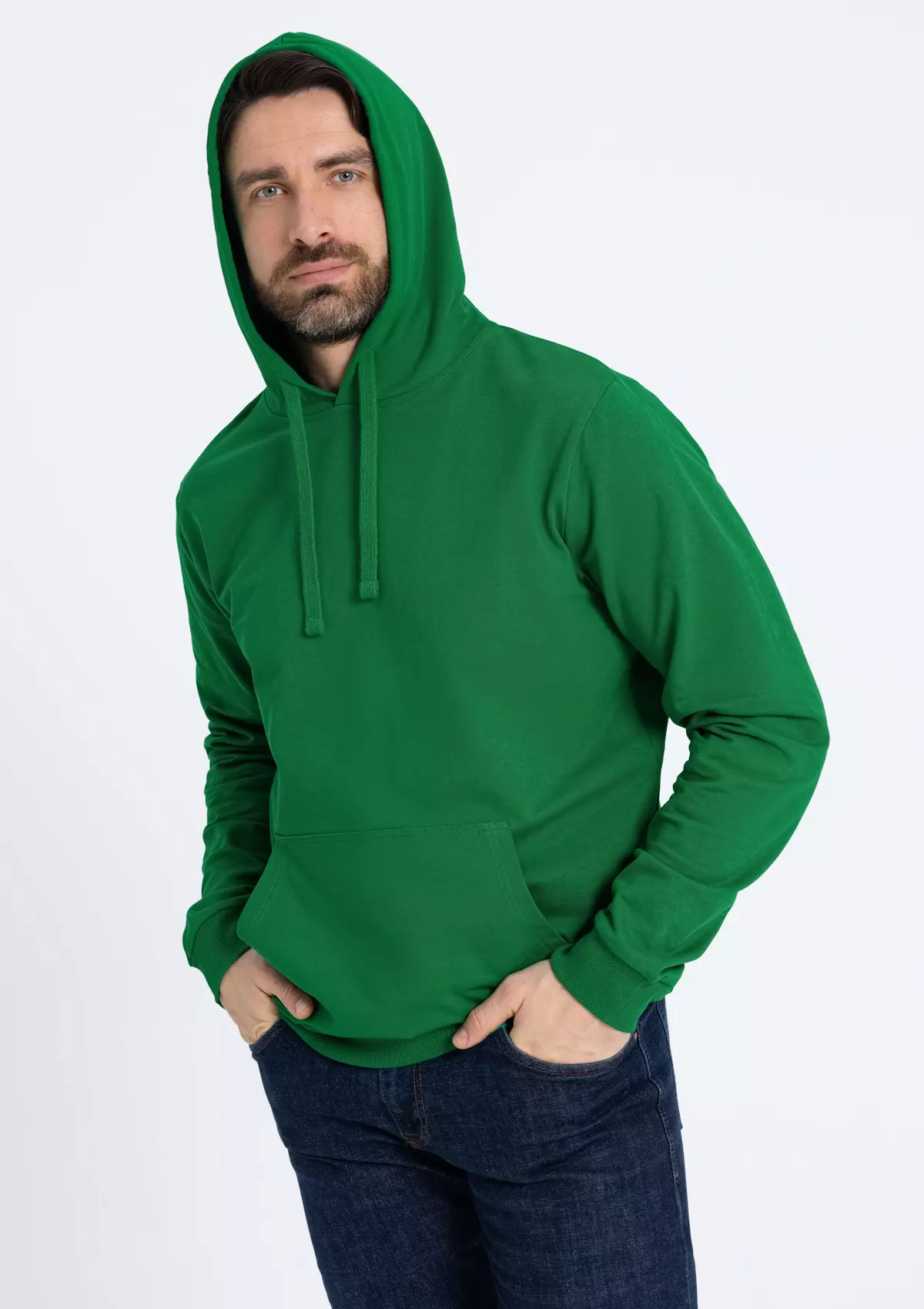 Толстовка прямого силуэта с капюшоном, втачным рукавом и карманом-кенгуру. Капюшон дополнен шнурком для регулирования прилегания, манжет и низ изделия оформлены широкой эластичной резинкой. Возможно два варианта исполнения: контрастные шнурок и бейка/шнурок и бейка в цвет толстовки.