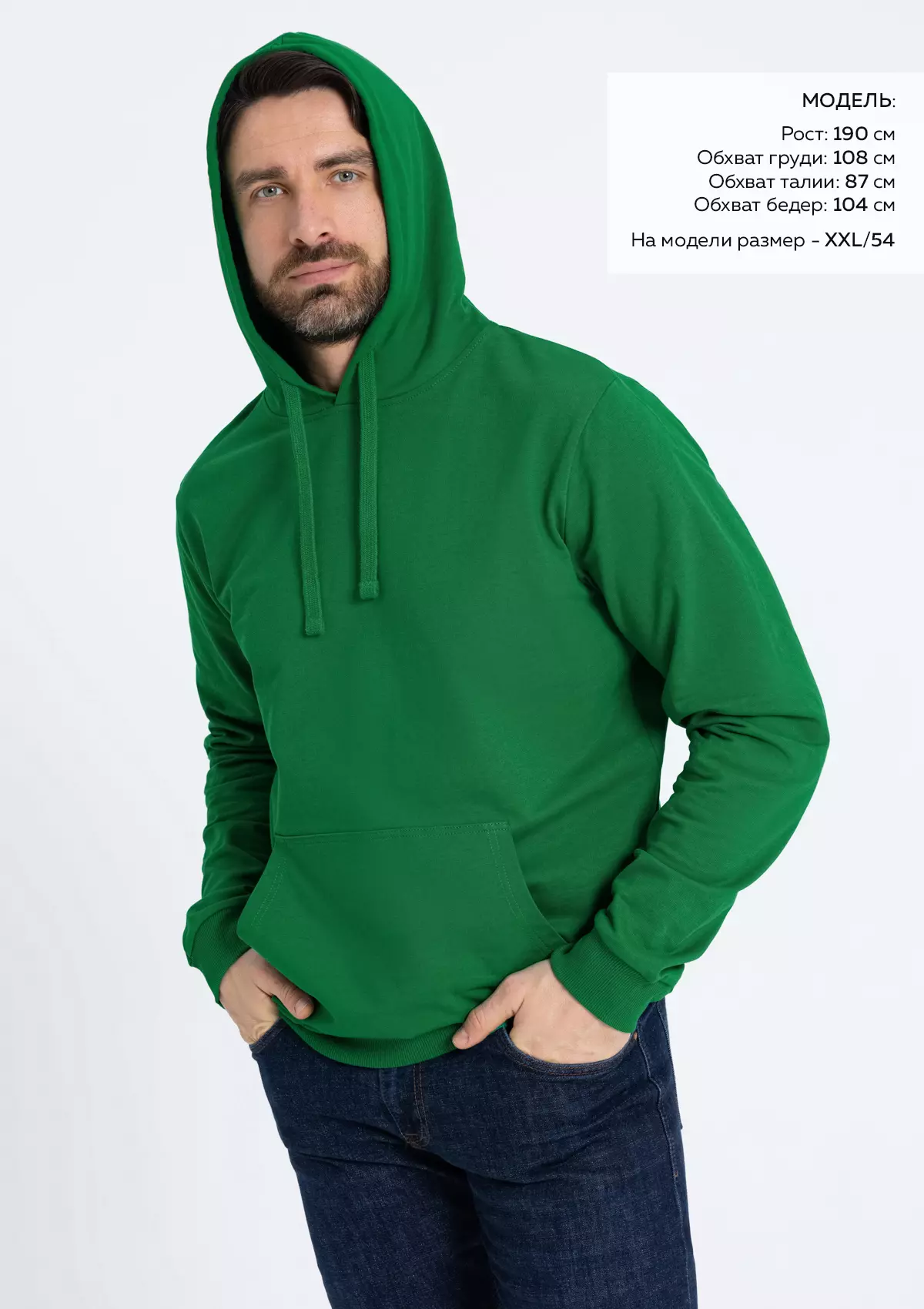 Размер мужского худи: XL/52. Параметры модели: рост 190 см.; обхват груди 108 см.; обхват талии 87 см.; обхват бедер 104 см.