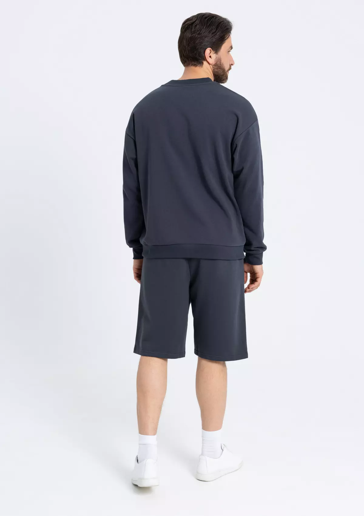 Свитшот расслабленного кроя с широкой горловиной, спущенной линией плеча и манжетами на рукавах по нижнему краю изделия.