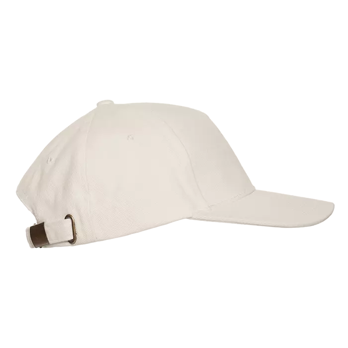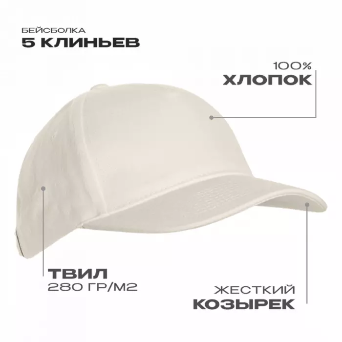 Бейсболка-пятиклинка без лобового шва с изогнутым жестким козырьком. Посадка регулируется ремешком на металлической застежке.