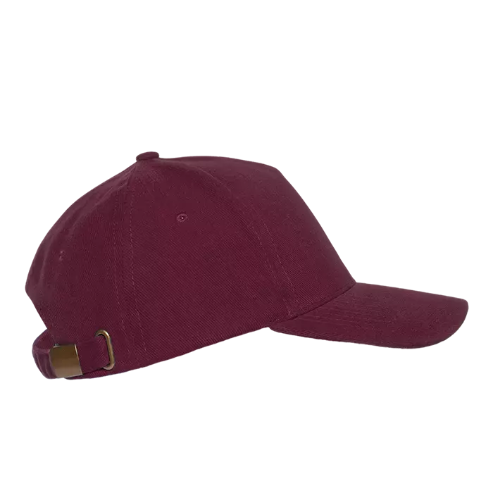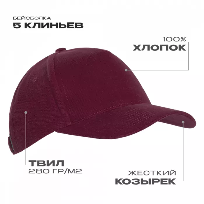 Бейсболка-пятиклинка без лобового шва с изогнутым жестким козырьком. Посадка регулируется ремешком на металлической застежке.