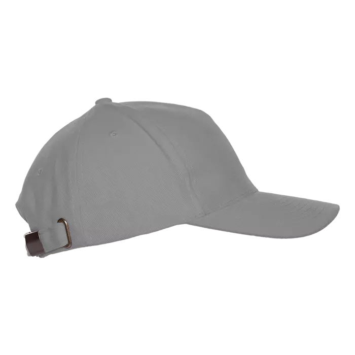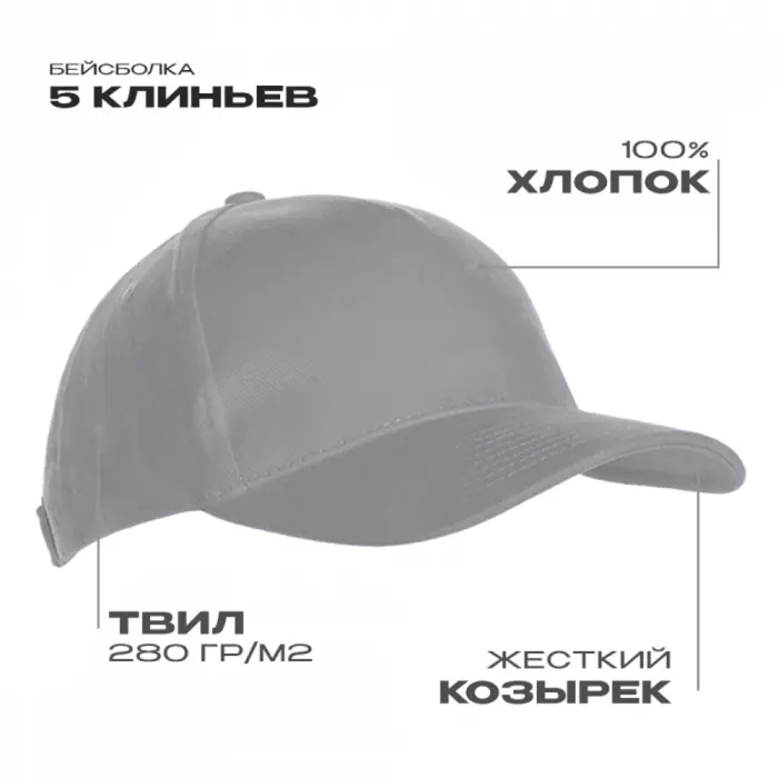 Бейсболка-пятиклинка без лобового шва с изогнутым жестким козырьком. Посадка регулируется ремешком на металлической застежке.