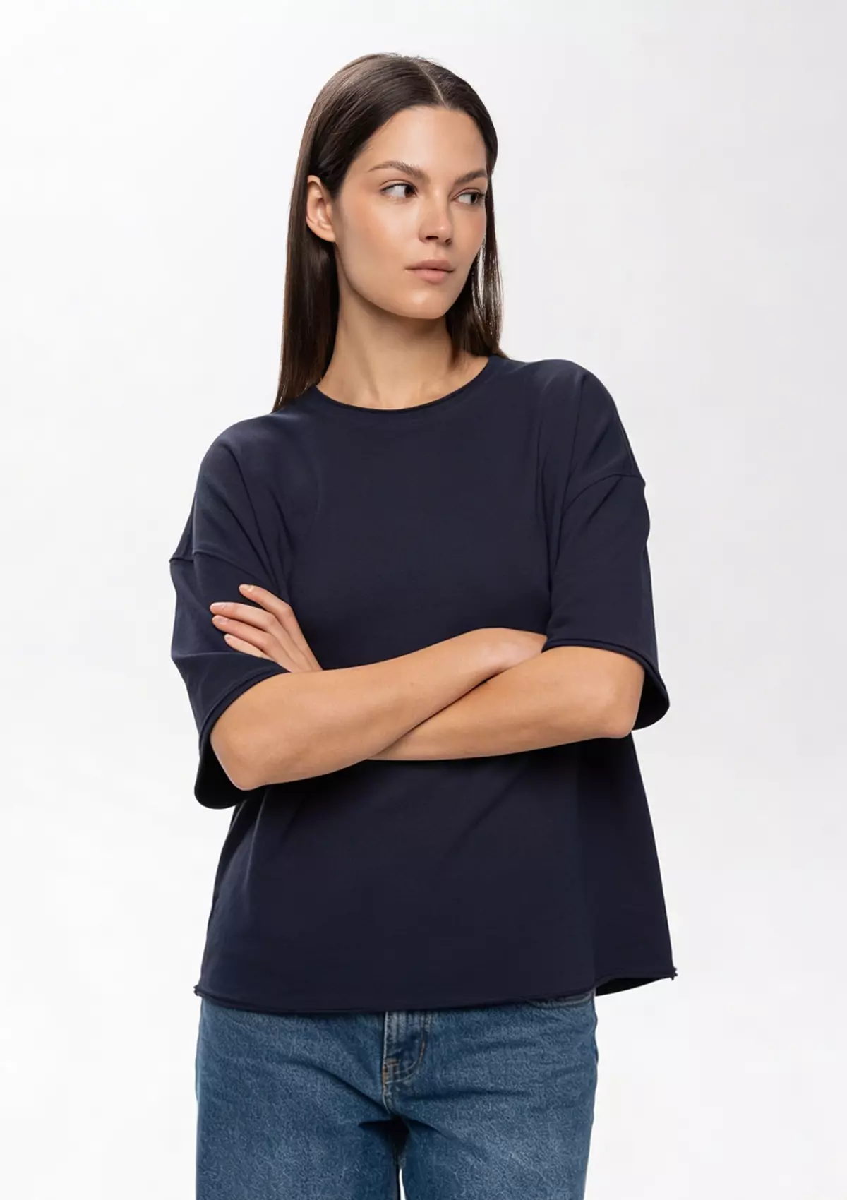 Футболка свободного силуэта с необработанными краями поможет создать стильный и неформальный образ. Данную футболку легко сочетать с джинсами, юбками и шортами, что делает модель универсальным выбором как для мероприятий, так и для униформы.
