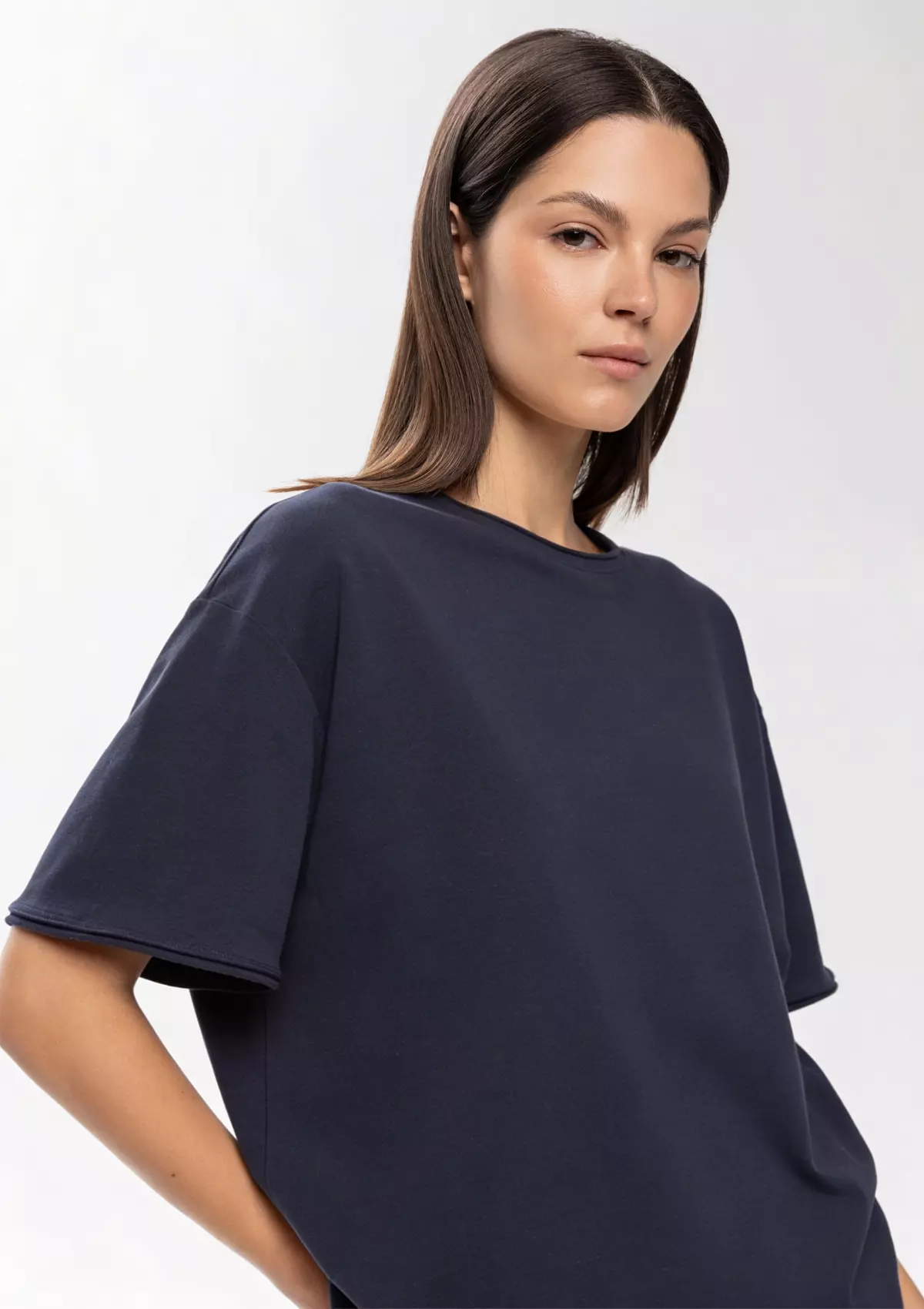 Футболка оверсайз-силуэта со спущенной линией плеча и необработанным краем рукава, горловины и по низу изделия.