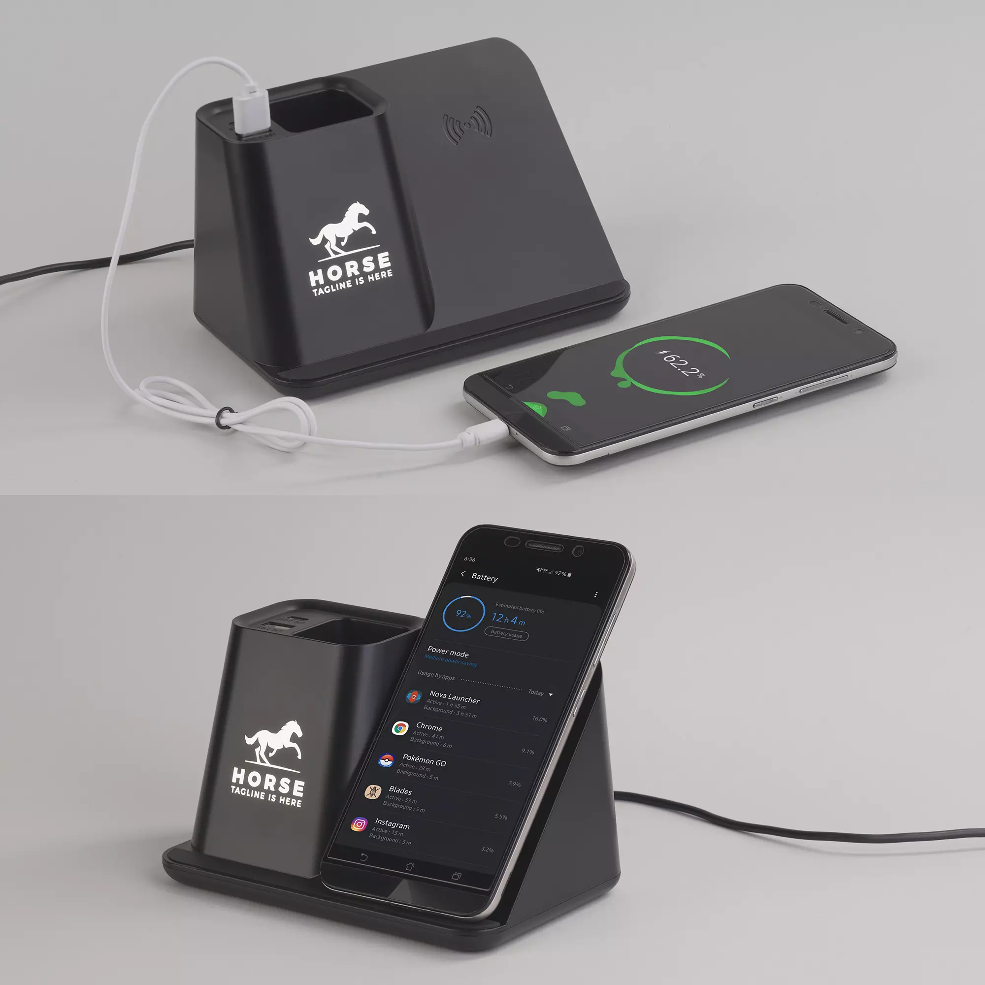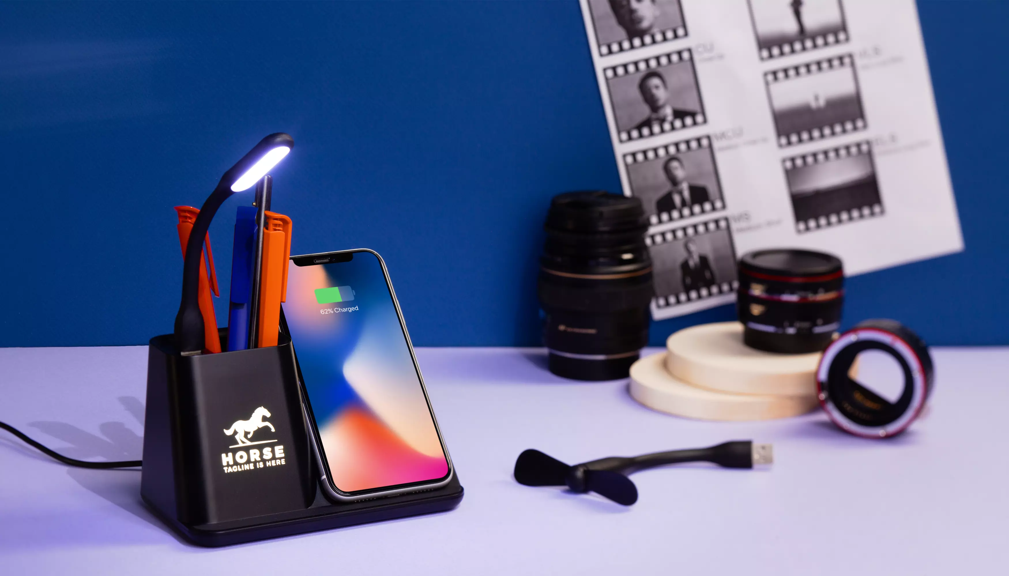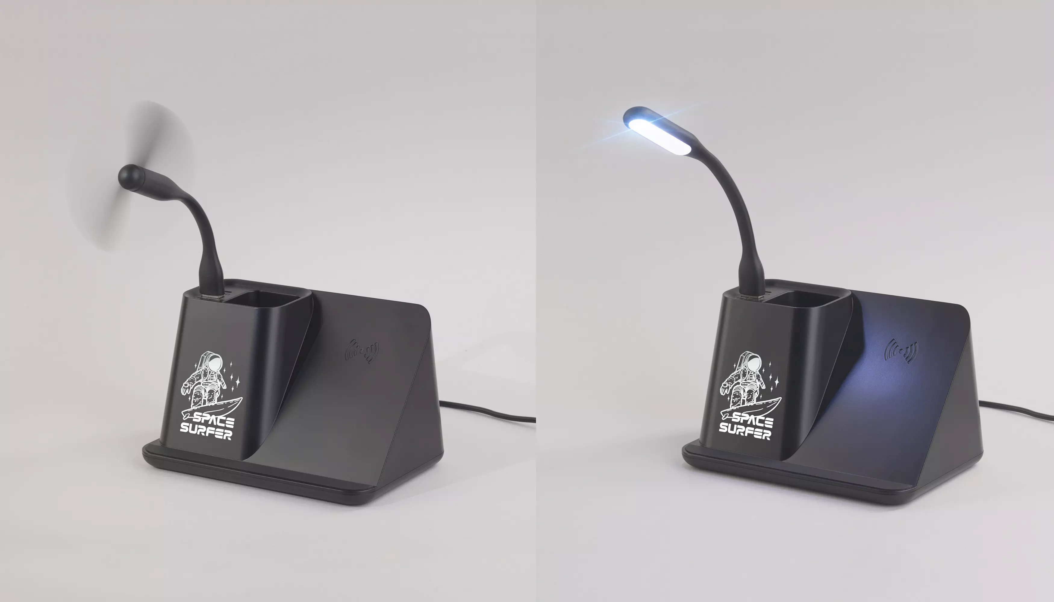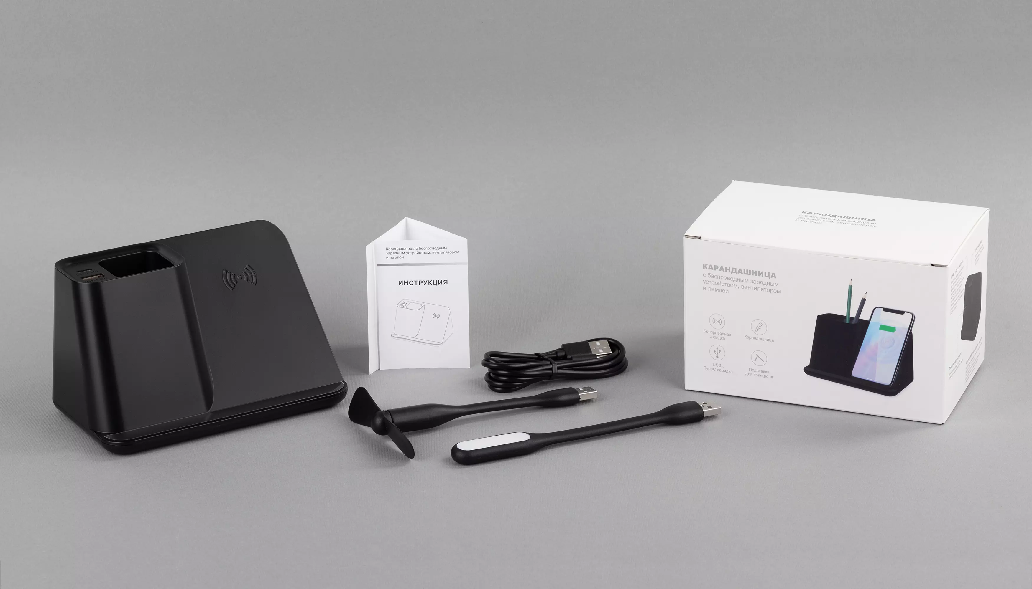 Многофункциональный гаджет с возможностью яркой персонализации – эффектной подсветкой логотипа. Кабель длиной 150 см. позволит подключить и разместить карандашницу в любом удобном месте Вашего рабочего стола. Комплект из персональных вентилятора и лампы дополнен актуальной, повышенной мощности (10W) функцией беспроводной зарядки. А для зарядки смартфона стандартным проводным способом можно использовать разъёмы USB или Type-C, находящиеся в карандашнице. Характеристики: Вход (Input): 9V–2A Выход USB и Type-C (Output): 5V–2A (Max) Модуль беспроводной зарядки: 10W (Max) В комплекте кабель USB/Type-C 150 см