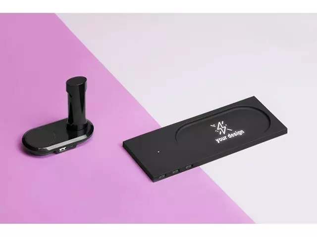 Беспроводное настольное зарядное устройство Glide выполнено из пластика с покрытием soft-touch. Кроме функции беспроводной зарядки имеет также 3 зарядных USB-разъема. Компактный органайзер имеет отсек для мелочи. После гравировки на устройстве вскрывается белый цвет подсветки, что позволяет сделать необычную и стильную персонализацию на этом гаджете.