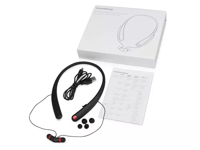 Беспроводная гарнитура "Soundway" может порадовать качественным звучанием на протяжении 8 часов без подзарядки. Гибкая дужка с покрытием soft-touch позволяет избежать любого дискомфорта даже при беге. В дужке находятся микрофон, современный аккумулятор, кнопка управления, защищенный разъем micro USB для зарядки и модуль вибро-оповещения, благодаря которому вы не пропустите ни один звонок. Когда наушники не используются их можно закрепить вокруг шеи при помощи магнитов. Гарнитура "Soundway" поставляется в подарочной упаковке на магнитах, в комплект входят кабель для зарядки, сменные насадки разных размеров и инструкция.