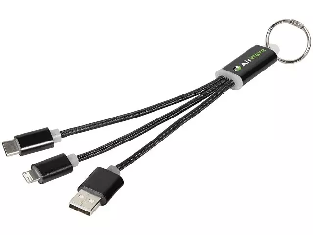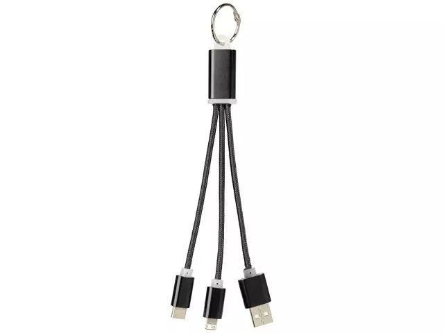 Кабель для зарядки Metal «3-в-1» с брелоком. Кабель для зарядки Metal «3-в-1» с брелоком. Кабель для зарядки Metal «3-в-1» с брелоком, коннекторами 1 type с, 1 USB type A и двойным совместимым коннектором «2-в-1» для устройств с ОС Apple® iOS и Android. В комплект входит брелок. Для зарядки устройств Apple подключайте кабель стороной без контактов; для зарядки устройств с ОС Android подключайте кабель стороной с контактами. Алюминий.