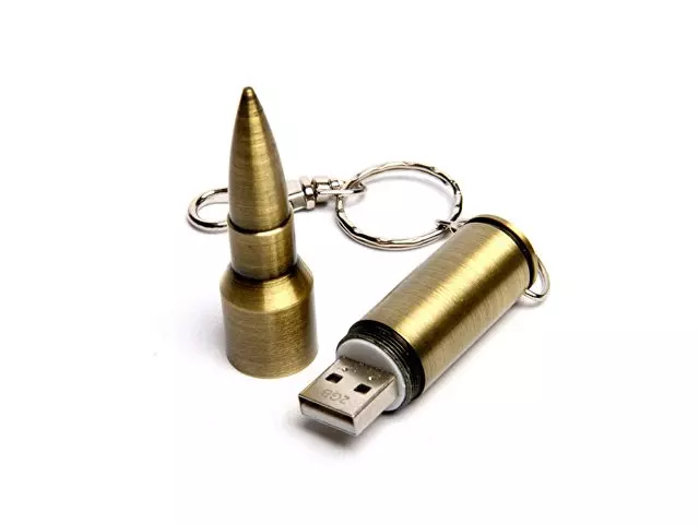 Флеш-накопитель в виде бронзового патрона от AK-47, 64 Гб. Металлический корпус. Cкорость чтения 70 Мб/c. Скорость записи 15 Мб/c.