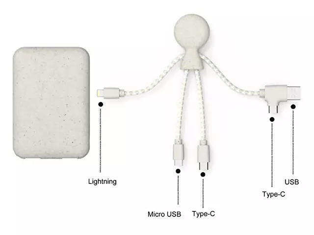 Внешний аккумулятор "BioPack" изготовлен из биоразлагаемого пластика и переработанной пшеничной соломы. Оплетка кабеля "Mr. Bio" изготовлена из переработанных пластиковых бутылок (Tyvek). Использование переработанных материалов при производстве BioPack позволяет сократить пластиковое загрязнение планеты. Заряжайте свои устройства, не нанося вред экологии!
