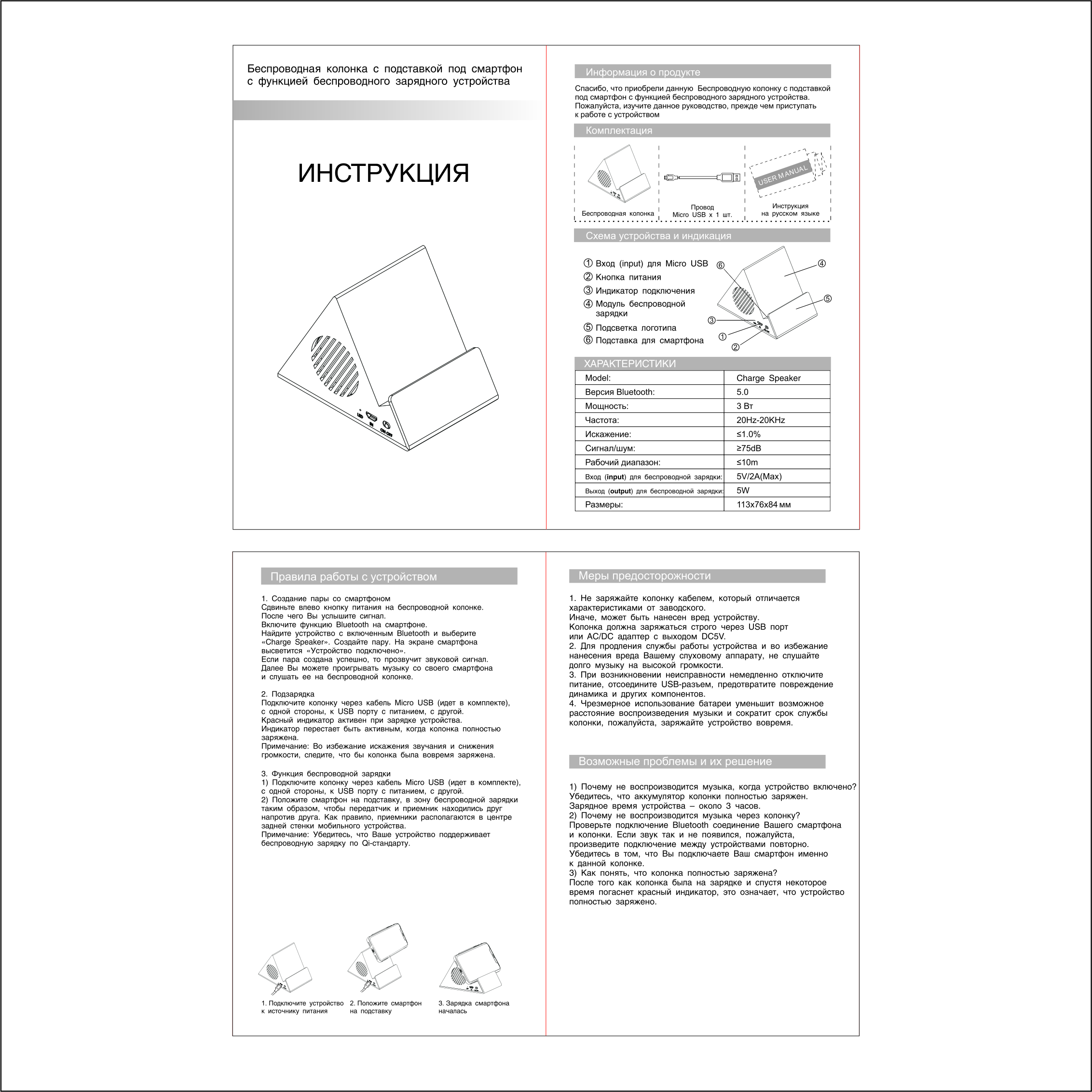 Компактная колонка совмещает в себе уникальный дизайн, хорошее качество звука и популярную, удобную функцию беспроводного заряда! Функционал позволяет разместить телефон так, чтобы было комфортно и пользоваться им, и управлять воспроизведением аудио. Характеристики: - выходная мощность воспроизведения аудио 3 Вт; - время работы аудио без подзарядки - 4-5 часов; - время полного заряда устройства 2-3 часа; - диапазон воспроизведения аудио - 10 м.; - мощность беспроводного заряда 5 Вт; - тип элемента питания: литий-полимерный; - кабель для зарядки в комплекте.