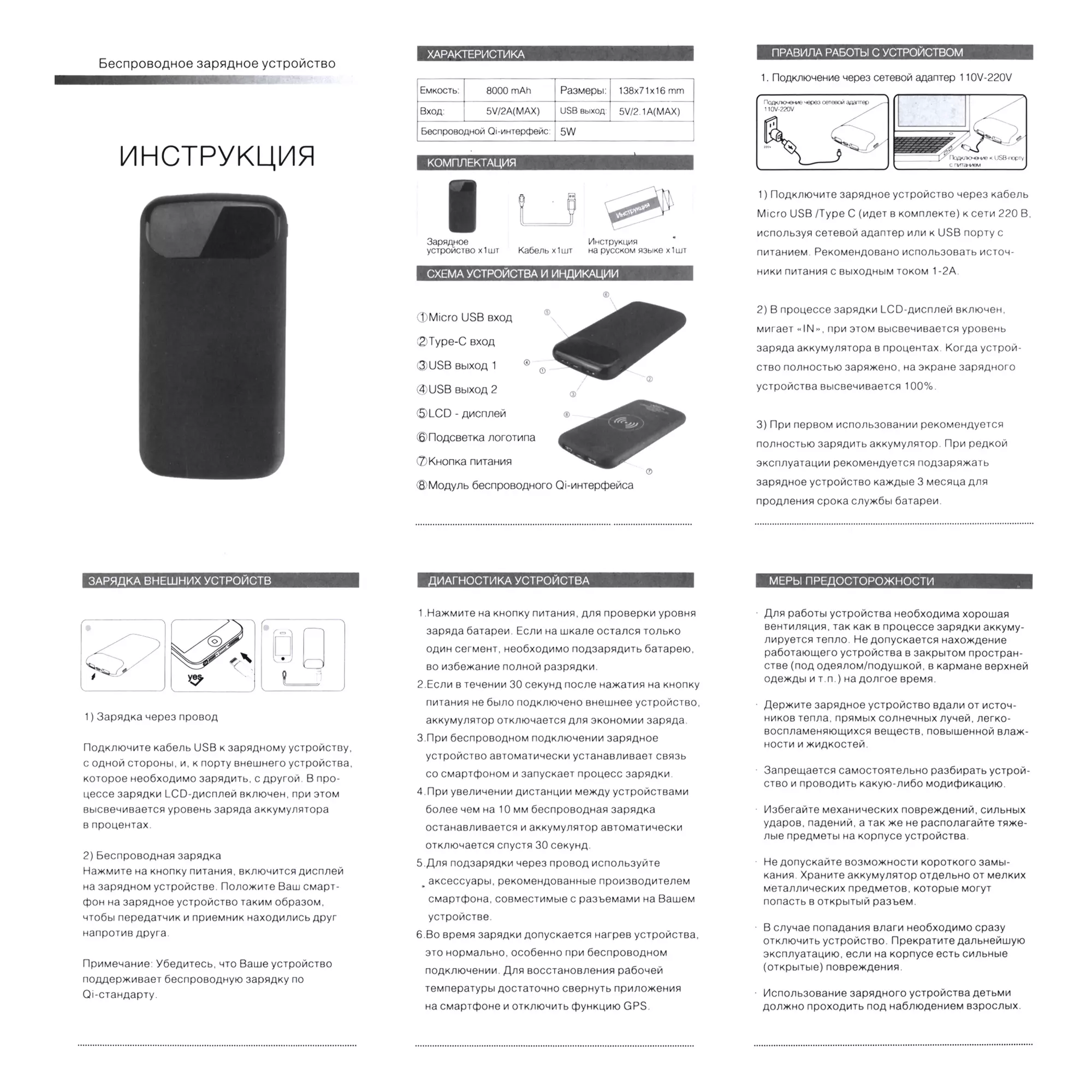В данной модели беспроводного зарядного устройства " " сочетаются передовые решения и современный функционал, как следствие пользователи получили совершенную эргономику, а бренд яркую персонализацию в виде подсветки логотипа. Для принудительного отключения питания и соответственно, подсветки, необходимо двойное нажатие на кнопку питания. Технические характеристики: - тип элемента питания: литий-полимерный; - емкость: 8 000 mAh; - время полной зарядки батареи до 4 часов при токе 5V/2.0А; - индикатор заряда устройства в процентах; - встроенная защита от перегрева; Параметры тока: - Вход Type-C (input): 5V/2.0А; - Вход microUSB (input): 5V/2.0A; - Выход USBх2 шт. (output): 5V/2.1А; - Беспроводной выход (wireless output): 5W; В комплекте: кабель USB/Type-C длинной 29 см; инструкция на русском языке.