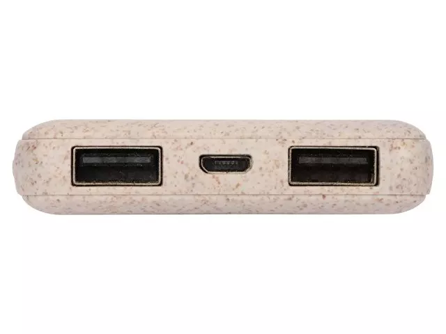 Портативное зарядное устройство "Wheatty" на 35% состоит из переработанной пшеничной соломы, что является положительным примером сокращения производства и потребления пластика в мире. Повербанк имеет миниатюрный размер и небольшой вес. Может заряжать два устройства одновременно. Поставляется в крафт упаковке из переработанной бумаги
