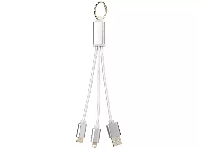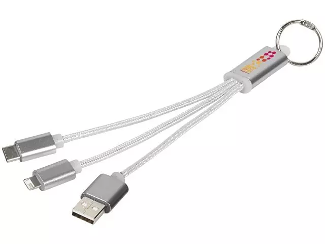 Кабель для зарядки Metal «3-в-1» с брелоком. Кабель для зарядки Metal «3-в-1» с брелоком. Кабель для зарядки Metal «3-в-1» с брелоком, коннекторами 1 type с, 1 USB type A и двойным совместимым коннектором «2-в-1» для устройств с ОС Apple® iOS и Android. В комплект входит брелок. Для зарядки устройств Apple подключайте кабель стороной без контактов; для зарядки устройств с ОС Android подключайте кабель стороной с контактами. Алюминий.