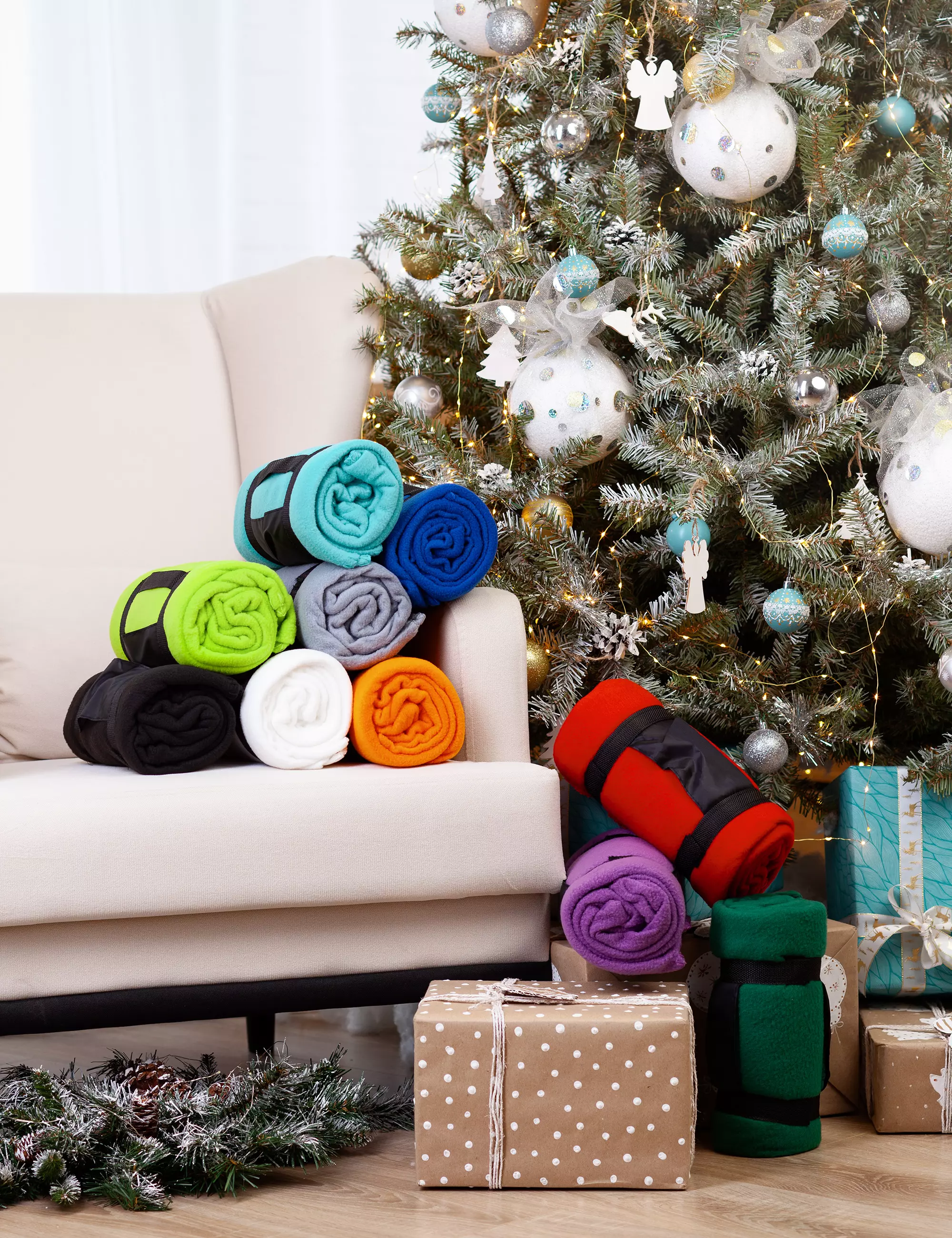 Благодаря ручке-фиксатору плед складывается, тем самым экономя место - размер в сложенном виде 26 х d 12 см, планка для нанесения 11,5 х 4,3 см. Плотность флиса 180 гр/м2.