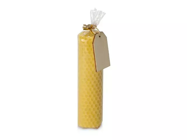 Свеча изготовлена вручную из крашеной вощины. Вощина - это рифленая пластина изготовленная из воскового сырья, которая имитирует донышки сотовых ячеек.