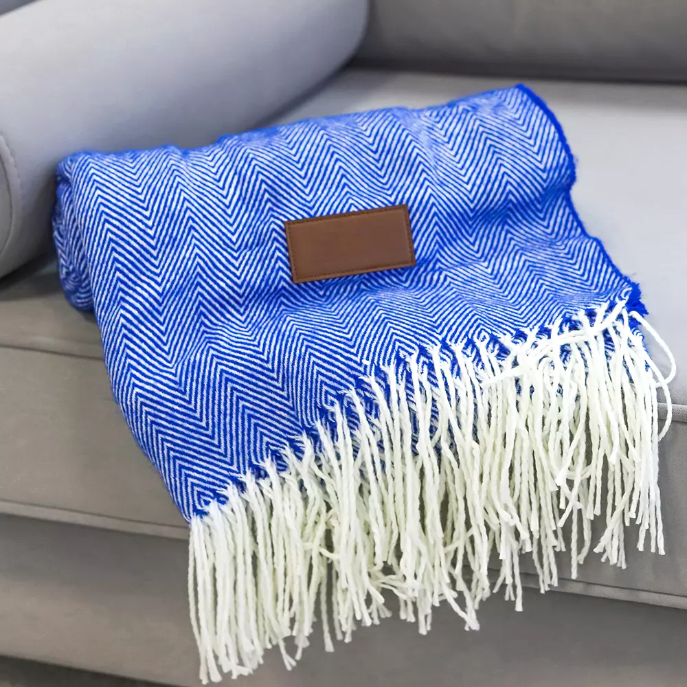 Плед SAMUM изготовлен из высококачественной акриловой пряжи, что позовляет добиться мягкости и тепла как от натуральной шерсти. Благодаря составу плед легкий, хорошо сохраняет теплоизолирующие свойства и надолго радует внешним видом. Также гипоаллергенен, не накапливает статическое электричество и легко стирается. Плед имеет классический узор "елочка", с бахромой по краям. Для нанесения логотипа предусмотрена нашивка из кожзама. Плед упакован в пластиковый пакет, сложен в виде рулона с текстильным держателем.