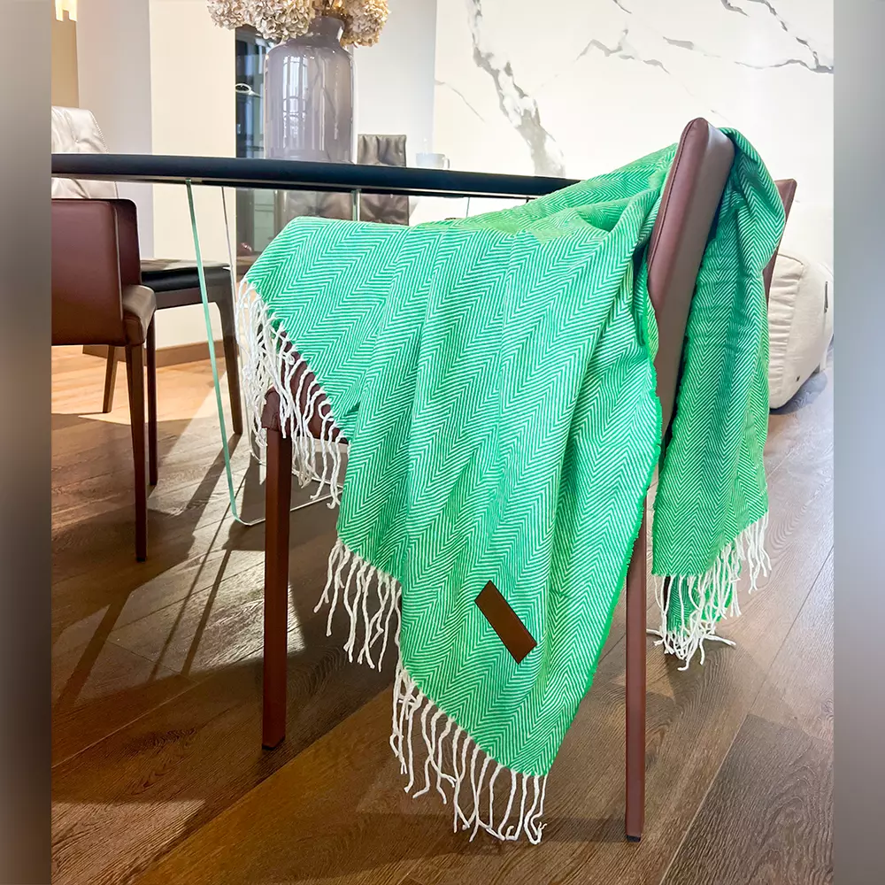 Плед SAMUM изготовлен из высококачественной акриловой пряжи, что позовляет добиться мягкости и тепла как от натуральной шерсти. Благодаря составу плед легкий, хорошо сохраняет теплоизолирующие свойства и надолго радует внешним видом. Также гипоаллергенен, не накапливает статическое электричество и легко стирается. Плед имеет классический узор "елочка", с бахромой по краям. Для нанесения логотипа предусмотрена нашивка из кожзама. Плед упакован в пластиковый пакет, сложен в виде рулона с текстильным держателем.
