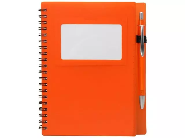 Блокнот «Контакт» в полипропиленовой обложке переплетен на пружине. В обложке блокнота предусмотрено окошко, в которое можно поместить визитную карточку или полиграфическую вставку. В комплекте с блокнотом идет ручка, которая вставляется в петельку сбоку. Размер окошка внешний 8,4 х 4,8 см, внутренний 10 х 6,5 см.