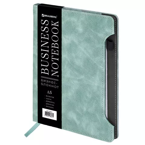 Блокнот А5 165x218мм BRAUBERG Perfect, под кожу софт-тач, держатель для ручки, 80 листов, клетка, серо-голубой, 116615