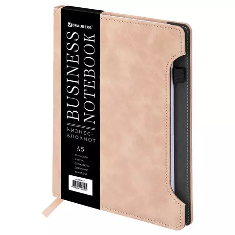 Блокнот А5 138x213 мм BRAUBERG Velvet, резинка, держатель, 80 л., клетка, бежевый, 116240