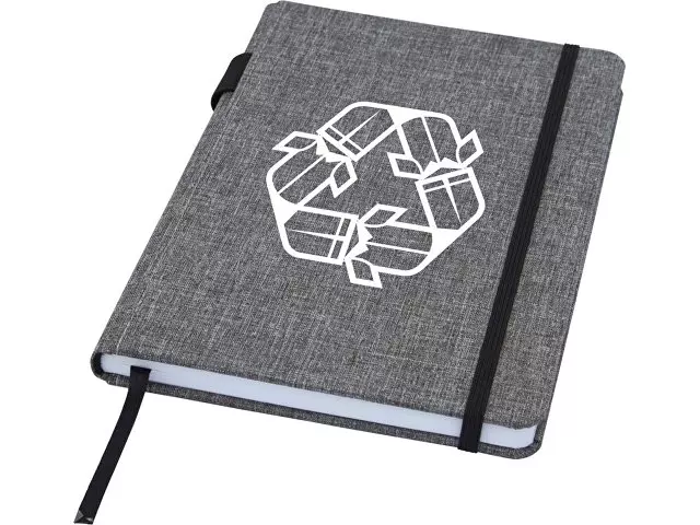 Блокнот формата А5 с отделкой из переработанного ПЭТ. Содержит 96 листов в линию плотностью 70 г/м², изготовленных из переработанной бумаги, с петлей для ручки и лентой-закладкой. В упаковке из картона.