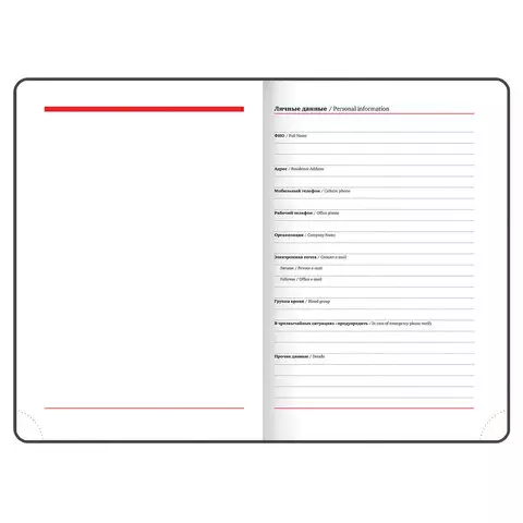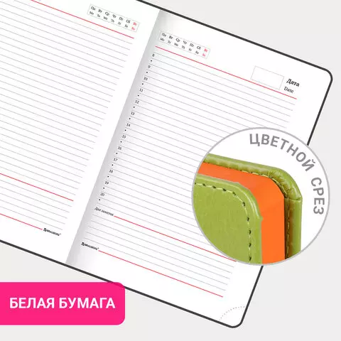 Внутренний блок включает 136 листов белой бумаги плотностью 70 г/м2. Каждая страничка имеет перфорированный угол. Благодаря стандартному формату А5 (138х213 мм) ежедневник удобно использовать как в офисе, так и на выездных деловых встречах. Твердая обложка стилизована под гладкую кожу. Подходит для горячего тиснения. Срез и форзац ежедневника окрашены на контрасте с цветом обложки, что придает ему особый шарм. Дополнением является закладка-ляссе, с помощью которой при необходимости можно быстро открыть ежедневник на нужной странице. Помимо прочего ежедневник снабжен обширным справочным материалом.