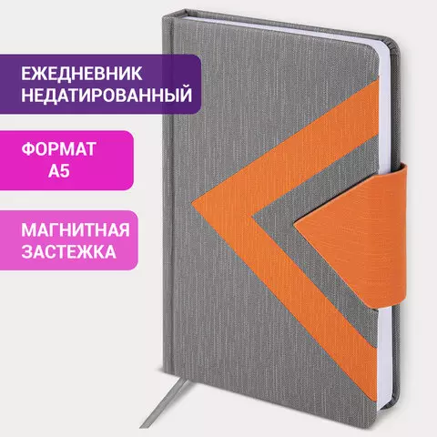 Внутренний блок включает 160 листов белой бумаги плотностью 70 г/м2. Каждая страничка имеет перфорированный угол. Благодаря стандартному формату А5 ежедневник удобно использовать как в офисе, так и на выездных деловых встречах. Твердая обложка, стилизованная под гладкую кожу, подходит для горячего тиснения. Снабжен магнитной застежкой, благодаря чему ежедневник не откроется в сумке или портфеле. Форзац ежедневника представлен картами мира и России. Дополнением является закладка-ляссе, с помощью которой при необходимости можно быстро открыть ежедневник на нужной странице. Помимо прочего ежедневник снабжен справочным материалом. Выполнен в комбинации из двух цветов - серый и оранжевый.