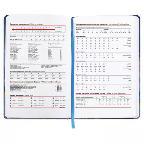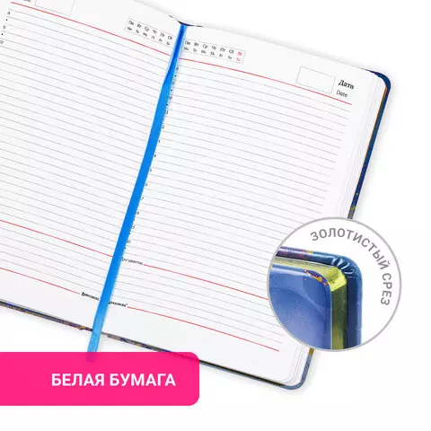 Внутренний блок включает 136 листов белой бумаги плотностью 70 г/м2. Благодаря стандартному формату А5 ежедневник удобно использовать как в офисе, так и на выездных деловых встречах. Твердая (книжная) обложка с полноцветной печатью и тиснением золотой фольгой делает ежедневник неповторимым и запоминающимся. Срез ежедневника фольгирован золотой фольгой, что придает ему особый шарм. Дополнением является закладка-ляссе, с помощью которой можно быстро открыть ежедневник на нужной странице.