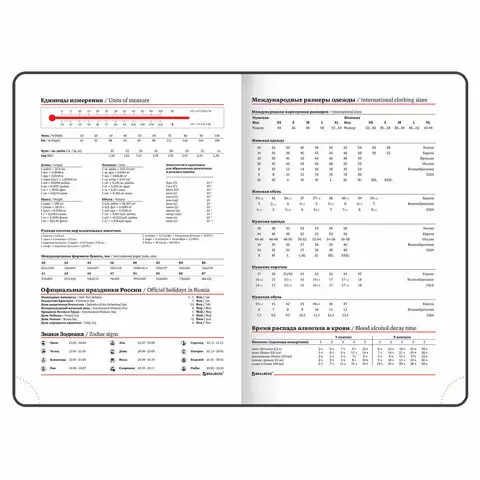 Внутренний блок включает 136 листов белой бумаги плотностью 70 г/м2. Благодаря стандартному формату А5 ежедневник удобно использовать как в офисе, так и на выездных деловых встречах. Интегральная (мягкая) обложка с полноцветной печатью делает ежедневник неповторимым и запоминающимся. Срез ежедневника прокрашен, что придает ему особый шарм. Дополнением является закладка-ляссе, с помощью которой можно быстро открыть ежедневник на нужной странице.