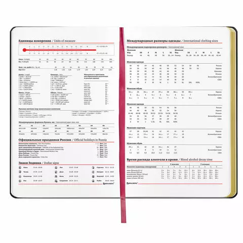 Внутренний блок включает 136 листов белой бумаги плотностью 70 г/м2. Благодаря стандартному формату А5 ежедневник удобно использовать как в офисе, так и на выездных деловых встречах. Интегральная (мягкая) обложка с полноцветной печатью и тиснением золотой фольгой делает ежедневник неповторимым и запоминающимся. Срез ежедневника фольгирован золотой фольгой, что придает ему особый шарм. Дополнением является закладка-ляссе, с помощью которой можно быстро открыть ежедневник на нужной странице.