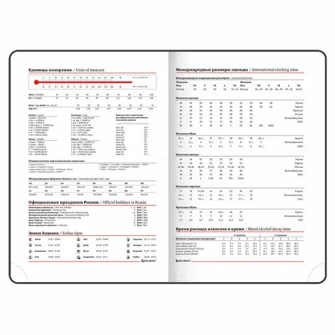 Внутренний блок включает 136 листов белой бумаги плотностью 70 г/м2. Благодаря стандартному формату А5 ежедневник удобно использовать как в офисе, так и на выездных деловых встречах. Интегральная (мягкая) обложка с полноцветной печатью делает ежедневник неповторимым и запоминающимся. Срез ежедневника прокрашен, что придает ему особый шарм. Дополнением является закладка-ляссе, с помощью которой можно быстро открыть ежедневник на нужной странице.