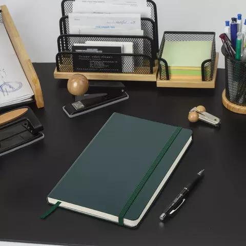 Твердая обложка стилизована под "классическую кожу". Имеет закругленные уголки, подходит для горячего тиснения и имеет резинку-фиксатор, благодаря чему не раскроется в сумке или портфеле и листы не помнутся. На внутренней стороне задней обложки есть декоративный конверт для разных мелочей в виде визиток, напоминалок или других милых и полезных мелочей. 96 листов позволят зафиксировать большой объем информации. Линовка блока в клетку (5х5 мм) дает возможность аккуратно заполнить цифровые значения, а также нанести чертежные зарисовки. Внутренний блок выполнен из офсета цвета слоновой кости плотностью 80 г/м2 и крепится к обложке с помощью книжного переплета. Дополнением является закладка-ляссе, с помощью которой при необходимости можно быстро открыть нужную страницу. Формат блокнота А5 (130х210 мм) позволит владельцу поместить его в кейс или сумку малых габаритов.
