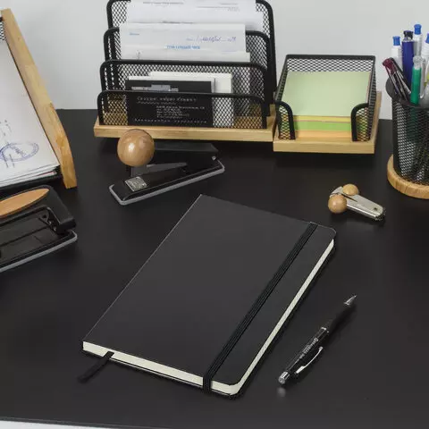 Твердая обложка стилизована под "классическую кожу". Имеет закругленные уголки, подходит для горячего тиснения и имеет резинку-фиксатор, благодаря чему не раскроется в сумке или портфеле и листы не помнутся. На внутренней стороне задней обложки есть декоративный конверт для разных мелочей в виде визиток, напоминалок или других милых и полезных мелочей. 96 листов позволят зафиксировать большой объем информации. Линовка блока в линию. Расстояние между линовками составляет 6 мм. Внутренний блок выполнен из офсета цвета слоновой кости плотностью 80 г/м2 и крепится к обложке с помощью книжного переплета. Дополнением является закладка-ляссе, с помощью которой при необходимости можно быстро открыть нужную страницу. Формат блокнота А5 (130х210 мм) позволит владельцу поместить его в кейс или сумку малых габаритов.