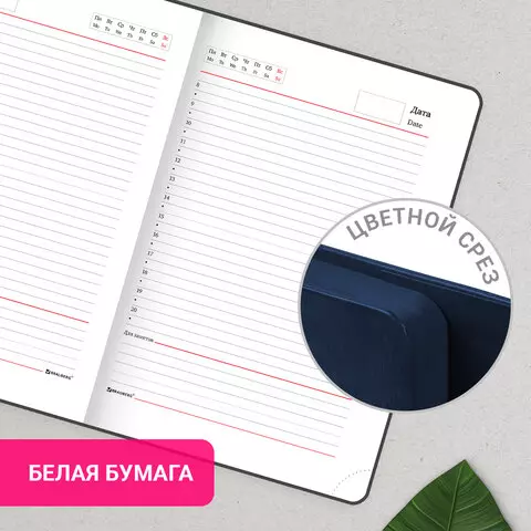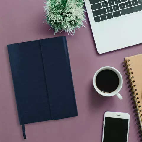 Внутренний блок включает 160 листов белой бумаги плотностью 70 г/м2. Каждая страничка имеет перфорированный угол. Благодаря стандартному формату А5 ежедневник удобно использовать как в офисе, так и на выездных деловых встречах. Интегральная (мягкая) обложка, выполненная в классическом темно-синем цвете и стилизованная под гладкую кожу, фиксируется магнитным клапаном, поэтому ежедневник не откроется в сумке или портфеле и страницы не помнутся. Подходит для горячего тиснения. Дополнением является закладка-ляссе, с помощью которой при необходимости можно быстро открыть ежедневник на нужной странице. Помимо прочего ежедневник снабжен обширным справочным материалом.