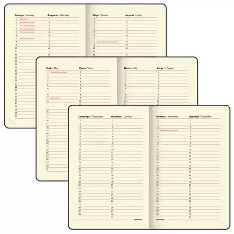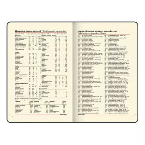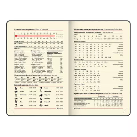 Внутренний блок включает 136 листов тонированной бумаги плотностью 70 г/м2. Каждая страничка имеет перфорированный угол. Благодаря малому формату А6 ежедневник удобно использовать как в офисе, так и на выездных деловых встречах. Интегральная обложка стилизована под гладкую кожу. Подходит для горячего тиснения. Срез и форзац ежедневника окрашены в контрастный цвет с обложкой, что придает ему особый шарм. Дополнением является закладка-ляссе, с помощью которой при необходимости можно быстро открыть ежедневник на нужной странице. Помимо прочего ежедневник снабжен обширным справочным материалом.