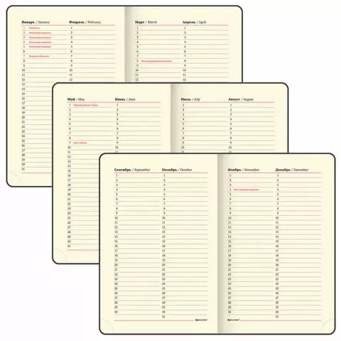 Внутренний блок включает 160 листов тонированной бумаги плотностью 70 г/м2. Каждая страничка имеет перфорированный угол. Благодаря стандартному формату А6 (100х150 мм) ежедневник удобно использовать как в офисе, так и на выездных деловых встречах. Твердая обложка стилизована под фактурную кожу. Подходит для горячего тиснения. Дополнением является закладка-ляссе, с помощью которой при необходимости можно быстро открыть ежедневник на нужной странице.