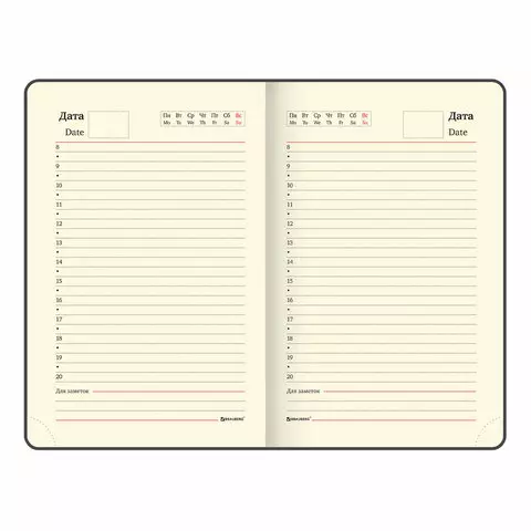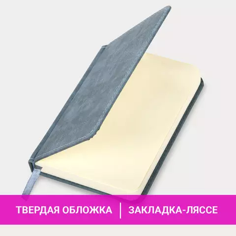 Внутренний блок включает 160 листов тонированной бумаги плотностью 70 г/м2. Каждая страничка имеет перфорированный угол. Благодаря стандартному формату А6 (100х150 мм) ежедневник удобно использовать как в офисе, так и на выездных деловых встречах. Твердая обложка стилизована под фактурную кожу. Подходит для горячего тиснения. Дополнением является закладка-ляссе, с помощью которой при необходимости можно быстро открыть ежедневник на нужной странице.