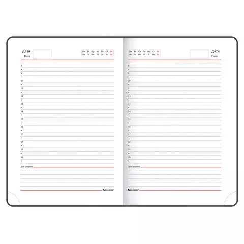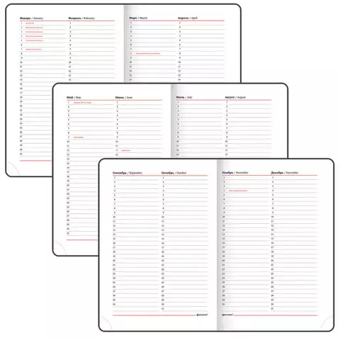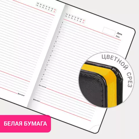 Внутренний блок включает 136 листов белой бумаги плотностью 70 г/м2. Каждая страничка имеет перфорированный угол. Благодаря стандартному формату А5 (138х213 мм) ежедневник удобно использовать как в офисе, так и на выездных деловых встречах. Твердая обложка стилизована под гладкую кожу. Подходит для горячего тиснения. Срез и форзац ежедневника окрашены на контрасте с цветом обложки, что придает ему особый шарм. Дополнением является закладка-ляссе, с помощью которой при необходимости можно быстро открыть ежедневник на нужной странице. Помимо прочего ежедневник снабжен обширным справочным материалом.