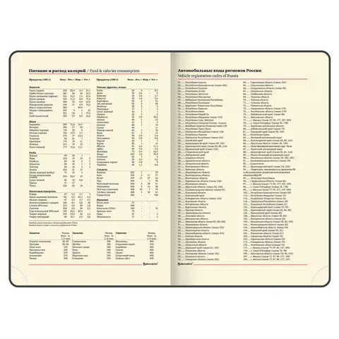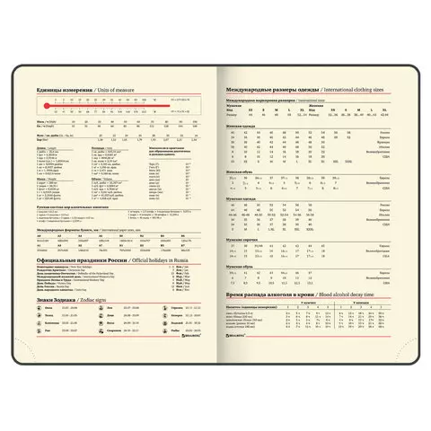 Внутренний блок включает 160 листов тонированной бумаги плотностью 70 г/м2. Каждая страничка имеет перфорированный угол. Благодаря стандартному формату А5 ежедневник удобно использовать как в офисе, так и на выездных деловых встречах. Твердая обложка, стилизованная под гладкую кожу, подходит для горячего тиснения. Дополнением является закладка-ляссе, с помощью которой при необходимости можно быстро открыть ежедневник на нужной странице. Помимо прочего ежедневник снабжен обширным справочным материалом.