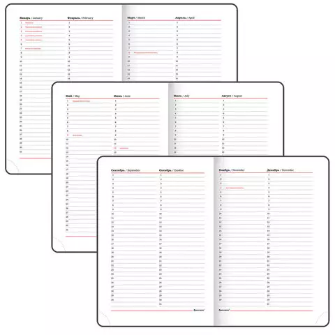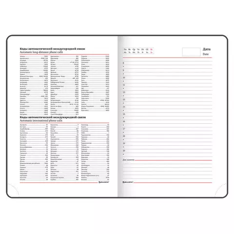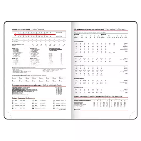 Внутренний блок включает 160 листов белой бумаги плотностью 70 г/м2. Каждая страничка имеет перфорированный угол. Благодаря стандартному формату А5 ежедневник удобно использовать как в офисе, так и на выездных деловых встречах. Твердая обложка стилизованная, под фактурную кожу, подходит для горячего тиснения. Дополнением является закладка-ляссе, с помощью которой при необходимости можно быстро открыть ежедневник на нужной странице. Помимо прочего ежедневник снабжен обширным справочным материалом.