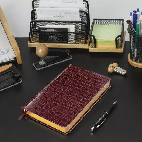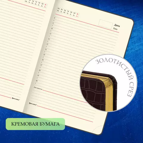 Внутренний блок включает 160 листов тонированной бумаги плотностью 70 г/м2. Каждая страничка имеет перфорированный угол. Благодаря стандартному формату А5 ежедневник удобно использовать как в офисе, так и на выездных деловых встречах. Твердая обложка стилизованная под кожу крокодила, подходит для горячего тиснения. Срез ежедневника фольгирован под "золото", что придает ему особый шарм. Дополнением является закладка-ляссе, с помощью которой при необходимости можно быстро открыть ежедневник на нужной странице. Помимо прочего ежедневник снабжен обширным справочным материалом.