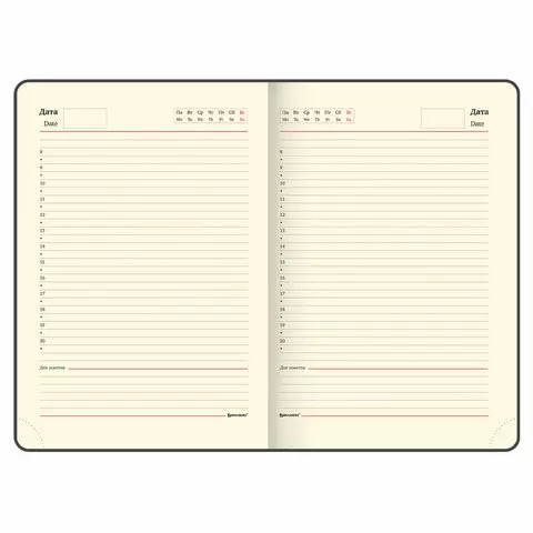 Внутренний блок включает 160 листов белой бумаги плотностью 70 г/м2. Каждая страничка имеет перфорированный угол. Благодаря большому формату В5 ежедневник удобно использовать как в офисе, так и на выездных деловых встречах. Твердая обложка, стилизованная под кожу крокодила, подходит для горячего тиснения. Дополнением является закладка-ляссе, с помощью которой при необходимости можно быстро открыть ежедневник на нужной странице. Помимо прочего ежедневник снабжен обширным справочным материалом.