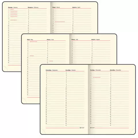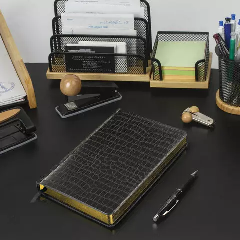 Внутренний блок включает 160 листов тонированной бумаги плотностью 70 г/м2. Каждая страничка имеет перфорированный угол. Благодаря стандартному формату А5 ежедневник удобно использовать как в офисе, так и на выездных деловых встречах. Твердая обложка, стилизованная под кожу крокодила, подходит для горячего тиснения. Срез ежедневника фольгирован под "золото", что придает ему особый шарм. Дополнением является закладка-ляссе, с помощью которой при необходимости можно быстро открыть ежедневник на нужной странице. Помимо прочего ежедневник снабжен обширным справочным материалом.