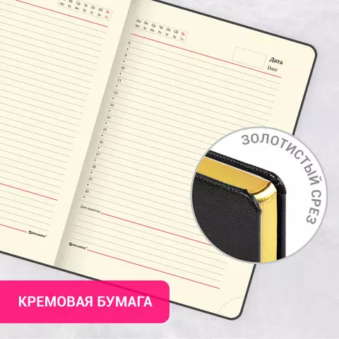 Внутренний блок включает 160 листов тонированной бумаги плотностью 70 г/м2. Каждая страничка имеет перфорированный угол. Благодаря стандартному формату А5 ежедневник удобно использовать как в офисе, так и на выездных деловых встречах. Твердая обложка, стилизованная под кожу рептилии, подходит для горячего тиснения. Срез ежедневника фольгирован под "золото", что придает ему особый шарм. Дополнением является закладка-ляссе, с помощью которой при необходимости можно быстро открыть ежедневник на нужной странице. Помимо прочего ежедневник снабжен обширным справочным материалом.