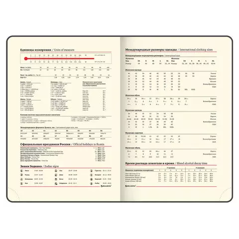 Внутренний блок включает 160 листов тонированной бумаги плотностью 70 г/м2. Каждая страничка имеет перфорированный угол. Благодаря стандартному формату А5 ежедневник удобно использовать как в офисе, так и на выездных деловых встречах. Твердая обложка, стилизованная под кожу рептилии, подходит для горячего тиснения. Срез ежедневника фольгирован под "золото", что придает ему особый шарм. Дополнением является закладка-ляссе, с помощью которой при необходимости можно быстро открыть ежедневник на нужной странице. Помимо прочего ежедневник снабжен обширным справочным материалом.