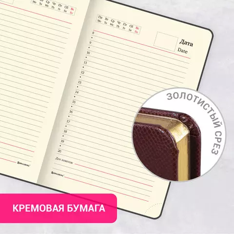Внутренний блок включает 160 листов тонированной бумаги плотностью 70 г/м2. Каждая страничка имеет перфорированный угол. Благодаря формату А6 ежедневник удобно использовать как в офисе, так и на выездных деловых встречах. Твердая обложка стилизованная, под кожу рептилии, подходит для горячего тиснения. Срез ежедневника фольгирован под "золото", что придает ему особый шарм. Дополнением является закладка-ляссе, с помощью которой при необходимости можно быстро открыть ежедневник на нужной странице. Помимо прочего ежедневник снабжен обширным справочным материалом.