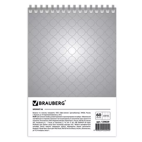 Блокнот формата А6 на евроспирали содержит 60 листов с линовкой в клетку, что позволяет зафиксировать большой объем нужной информации. Имеет верхнее расположение переплета. Обложка выполнена из мелованного картона плотностью 200 г/м2. Внутренний блок состоит из белой офсетной бумаги плотностью 60 г/м2.